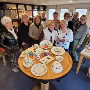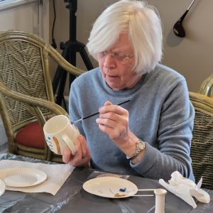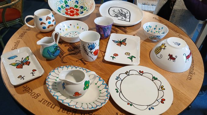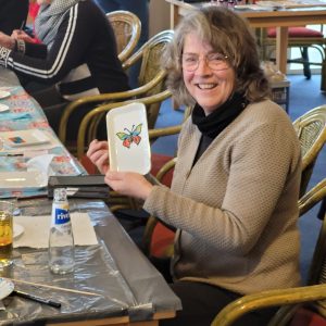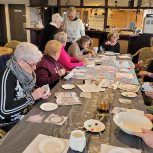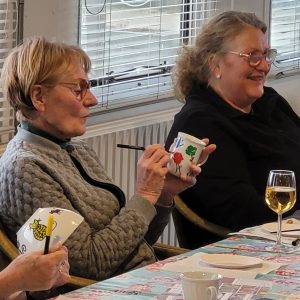 Na de nodige uitleg begon Adrie begon voortvarend aan het schilderen van katten in allerlei variaties op een kom. Bleken ze later op de kop te staan. “Dan zet ik de kom toch ook op de kop was haar nuchtere reactie”. Sanny begon aarzelend aan het beschilderen van een ontbijtbordje, maar uiteindelijk zag het er best fraai uit. Zo kwam een vlinder tevoorschijn en ook bloemetjes en stipjes kwamen voorbij.