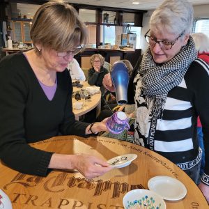 Schalen, kommetjes, bekers etc werden voorzien van fraaie kunstwerkjes. Alle aanwezigen genoten met volle teugen. “Goh best leuk om te doen” en “ik had niet verwacht dat ik iets voor mekaar zou krijgen”, hoorde je zeggen.