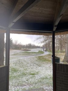 Ceciel was zo aardig om iedereen bij binnenkomst van een kop koffie/thee te voorzien met een heerlijk paaseitje. Vervolgens werd iedereen ingedeeld en konden we van start. “Het zou voorlopig droog blijven, maar niets was minder waar. Maar zoals Johan Cruijff al eens zei: Elk nadeel heeft zijn voordeel”, van hagel word je veel minder nat dan regen.